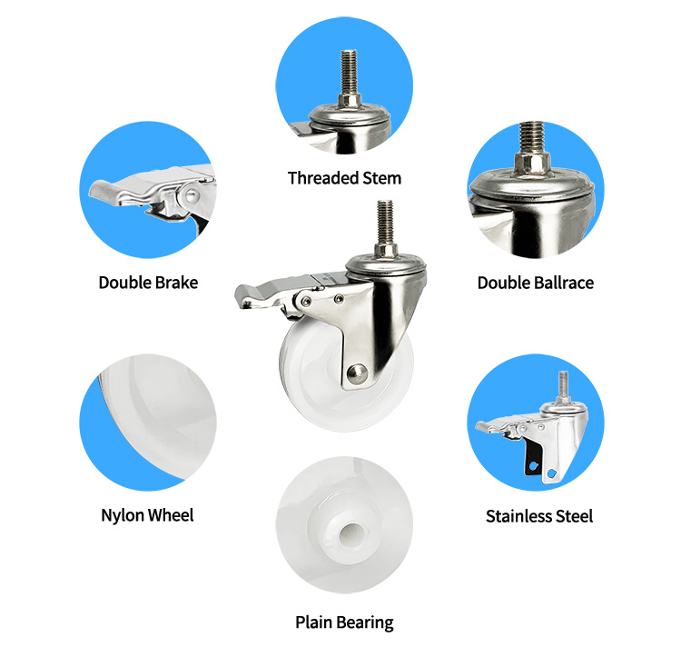3inch Threaded stem nylon wheels stainless steel lockable casters factory