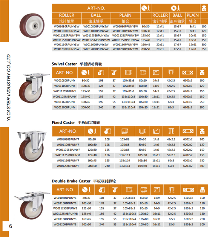 High-end Nylon core and Polyurethane PU core, with European top plate 105 x 85 mm, 160mm wheel diameters moves your heavy duty equipment and trolley smoothly.