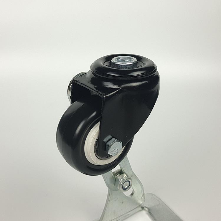 Bolt Hole light duty swivel lock black PVC casters, as literally means, the stamped and formed steel bracket is painted black by electrophoresis process. The hole size is 12.5mm. The wheel tread is made of black PVC material wrapped with white PP material wheel core, matched with double ball bearings, and it rotates smoothly. Suitable for all kinds of furniture, shelves, trolleys, etc.