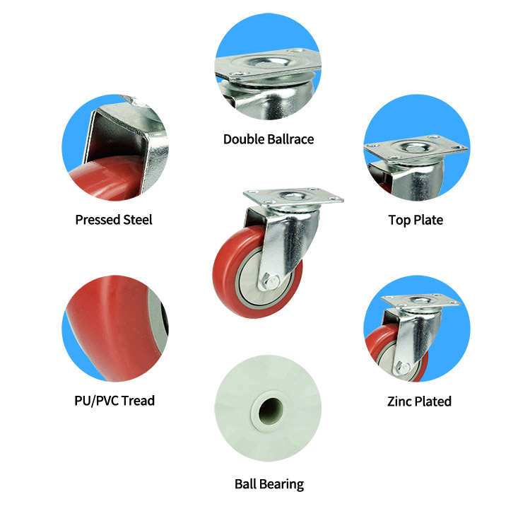 These red PVC/PU caster are 360 degree rotation, The wheels are assembled with single ball bearing, they can be easy to transform to any directions that you want, and good for transporting furniture and displays quietly and safely. Need stronger one? Click swivel casters to find out.