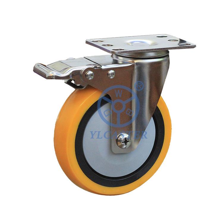 Total lock medium duty stainless steel bracket swivel plate orange PU or PVC casters, as literally means, the stamped and formed bracket is made of stainless steel. The wheel tread is made of orange PU or PVC material wrapped with black PP material wheel core, matched with double ball bearings, and it rotates smoothly. They can be made of different color, and logo are also customizable.